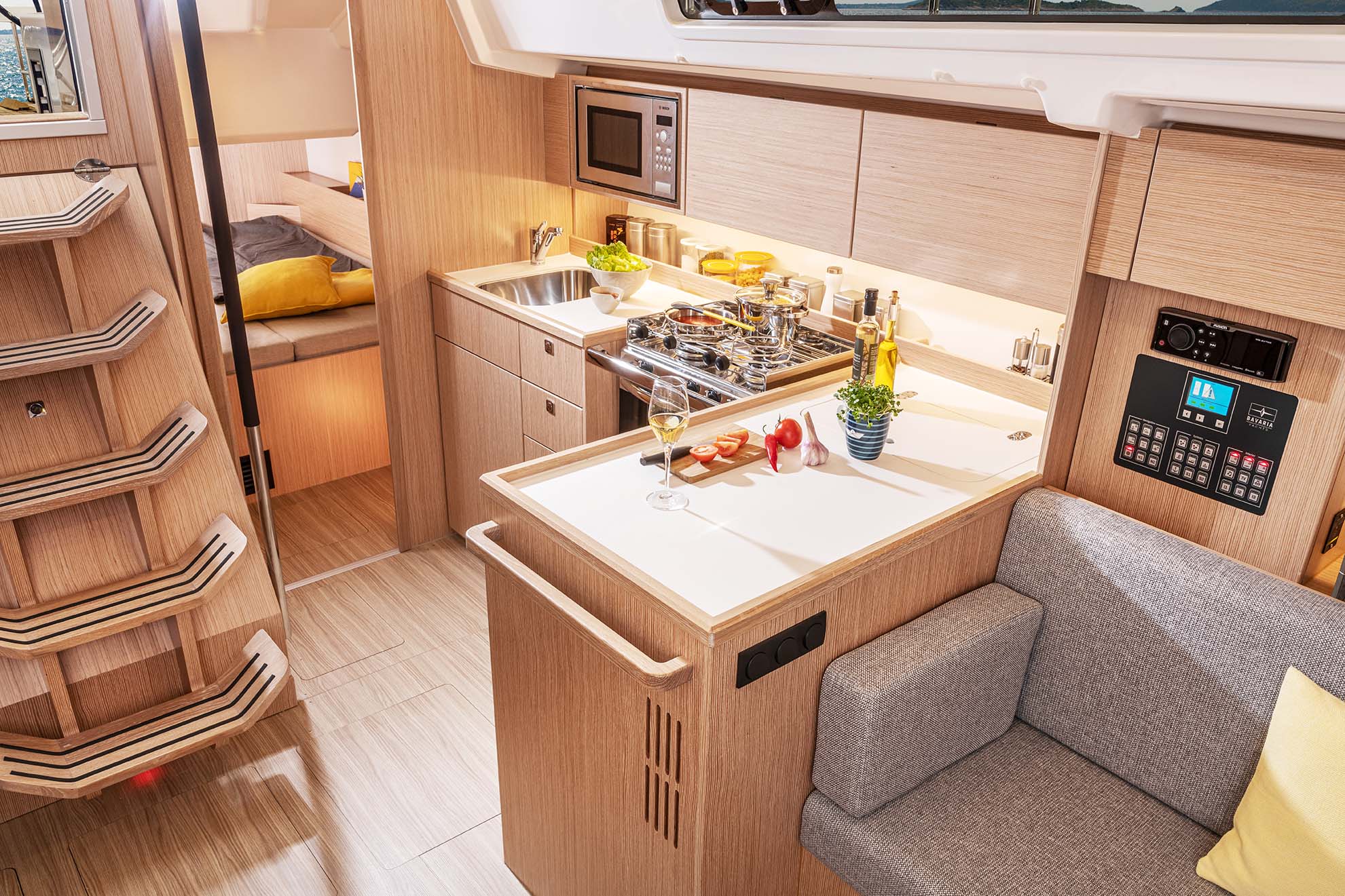 Mehr Stabilität eine längere Wasserlinie und damit mehr Performance sowie ein direkteres Gefühl beim Steuern, dafür sorgen die BAVARIA Chines. Der auffällige Knick im Heckbereich der BAVARIA C38 hat aber noch einen weiteren Vorteil. In den Achterkabinen entsteht mehr Raum und damit auch mehr Komfort. Vorschiff und Seitendecks bieten Ihnen viel Bewegungsfreiheit und dank des innovativen Rumpfdesign eröffnen sich auch unter Deck neue Dimensionen. Das individuelle Kabinenlayout, von der komfortablen 3-Kabinen-Version mit Bad eröffnet unter Deck ein einzigartiges Raumwunder. Sie können in der Vorschiffskabine in einem echten Kingsize Bett träumen - komfortable Stehhöhe und viel Tageslicht inklusive. In der U-Sitzgruppe an Steuerbord und auf der Lounge-Bank an Backbord können Sie mit acht Personen Platz ein gemütliches Dinner genießen. Die L-förmige Pantry befindet sich klassisch an Backbord.